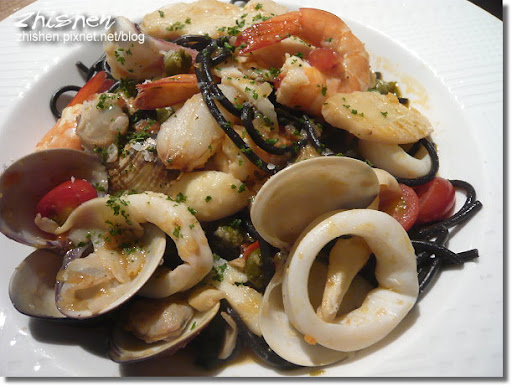 Ω奶油蔬菜濃湯 35塊大洋 不知何故,當日MENU上的湯品並無全部供應…所以我們就把僅存的兩種湯品給點了… 奶油蔬菜濃湯喝起來頗香濃,也滿順口,表現一般。 建議上桌後要儘快享用…否則淺盤內的湯很快就會涼掉了… Ω義式蕃茄牛肉燉湯 45塊大洋 蕃茄牛肉湯湯頭味道很夠,淡淡巴西利的香氣、蕃茄酸味明顯,湯裡頭的牛肉塊還嚐得到些許鮮味,還不錯喝… Ω龍蝦醬鮮蝦干貝義大利麵 260塊大洋 龍蝦醬蝦味超濃,加上一尾一尾的新鮮蝦肉和干貝,就是一整個鮮香…不過麵條的部份我個人不是很喜歡,因為是偏軟的那種 不過因為蝦醬味整個很濃鬱,讓牛爺吃到後面需要飲料搭配才比較吃得下去…所以她也沒有特別喜愛就對了XD不過就視覺上來說,算是滿上相的 Ω香辣海鮮墨魚義大利麵 260塊大洋 海鮮墨魚義大利麵因為多了蛤蜊、墨魚和蟹腳肉,在視覺及口感上也更加豊富;蕃茄醬汁的酸甜帶上微微的辣味,再加上海鮮的鮮甜,單就材料和調味來說,是很不錯的一品 不過麵條對我來說,還是不太及格…少了Q中帶硬的那種口感,多少有扣了一些感受分數,下次如果再次光臨的話,可能要事先跟小姐聲明一下 Ω提拉米蘇 招待的提拉米蘇,rosemary雖然是裝飾用的…不過我記得師傅有說過,盤子上的都可以吃,所以…rosemary配提拉米蘇一起享用嗎XD 除了擺盤美外,提拉米蘇本身味道不錯,有一點點小偏甜,不過我比較喜歡酒味更濃些的…