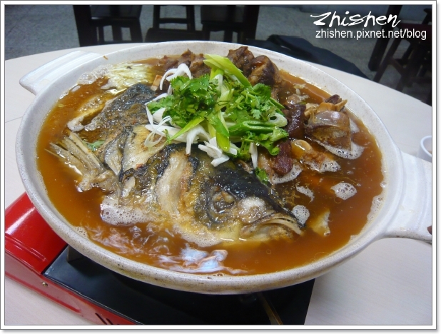 師傅推薦的魚羊鍋再上,和先前作功課時看到的魚頭+花蟹的上海式砂鍋魚頭鍋好像不太一樣,好像是用店家的平津紅悶羊肉鍋和花鰱魚頭來作個組合