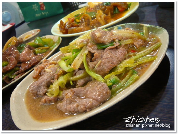 牛心片得像豬肝一樣的厚度,以薑絲、青椒一起拌炒,風味清新還帶點辣,爽口下飯